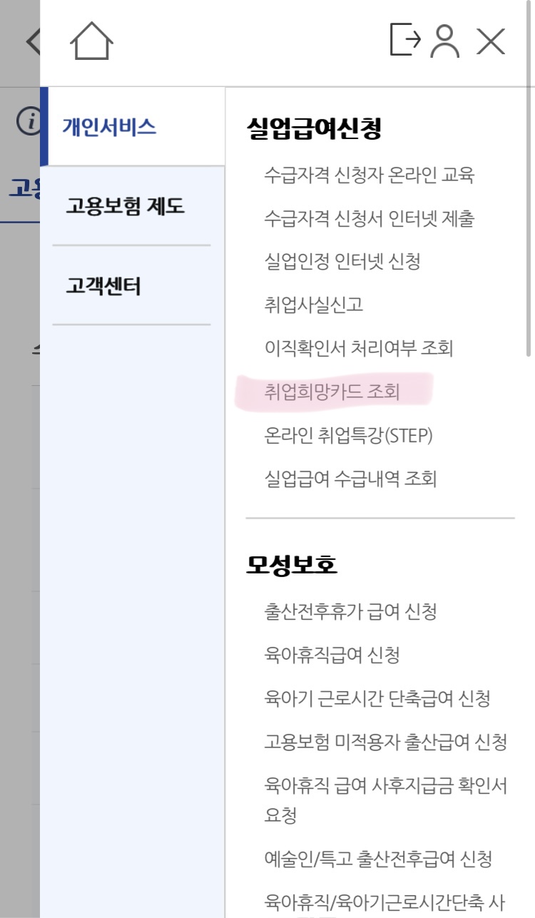 1. 취업희망카드 조회를 탭합니다.