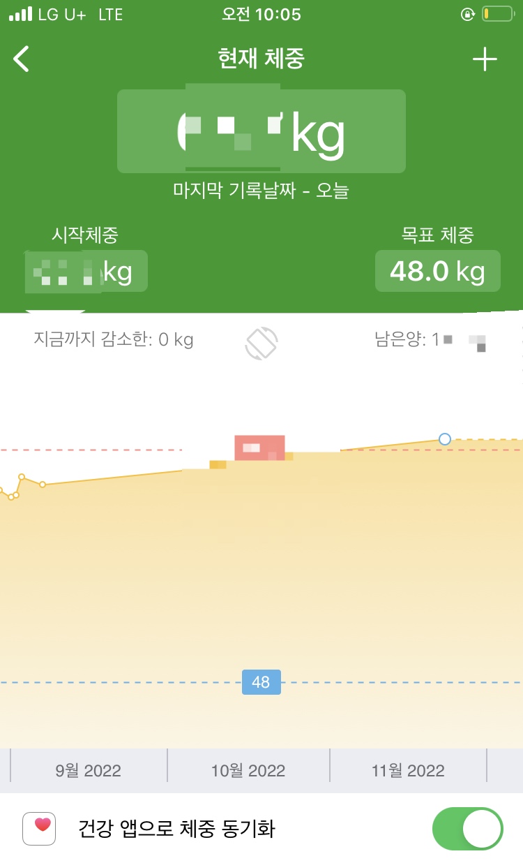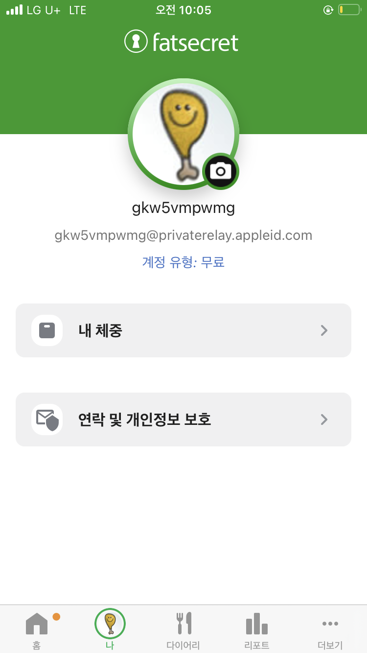 '나' 탭에서는 현재의 체중과 목표 체중을 결정할 수 있습니다. 체중을 동기화 할수도 있는데, 수기로 입력하거나 블루투스 체중계가 있으면 건강앱과 연결시켜 띄울수도 있습니다.