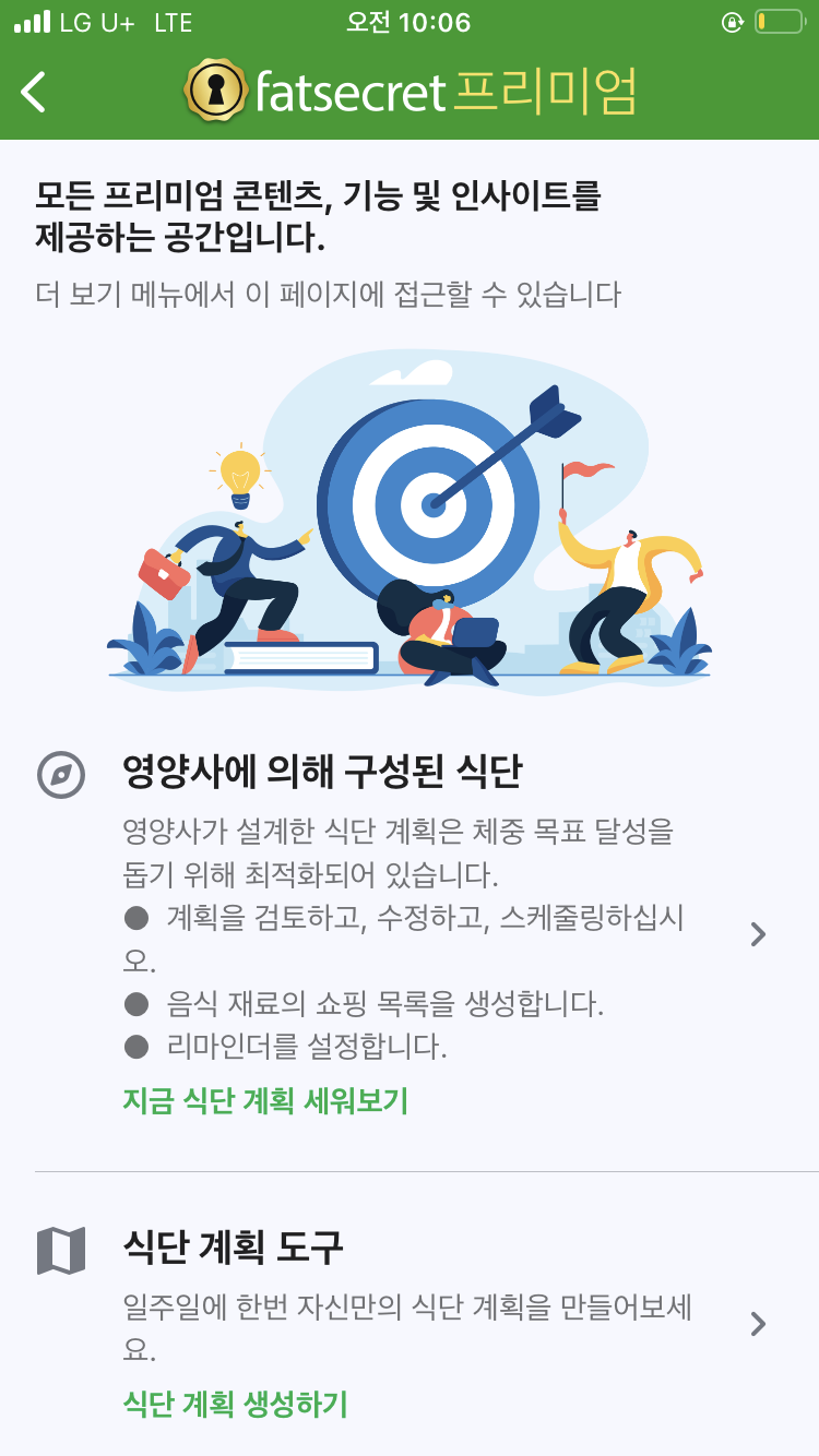 프리미엄 콘텐츠는 식단과 요리법을 무한으로 제공하고, 계획을 짤 수 있으며, 물 섭취량 추적이 가능합니다.